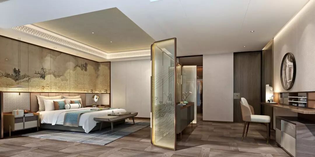 主卧背景以木框为直线线条元素,配合意境山水图,金色祥云弥漫整个山涧峡谷,灵动之处妙趣横生。禅意屏风将主卧空间一分为二,古典与现代的碰撞在屏风处戛然而止,空间运用恰到好处。