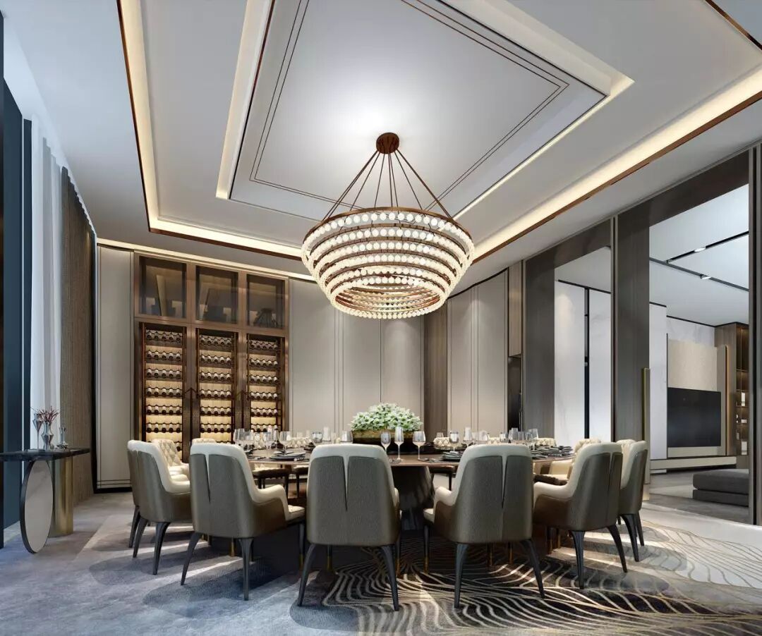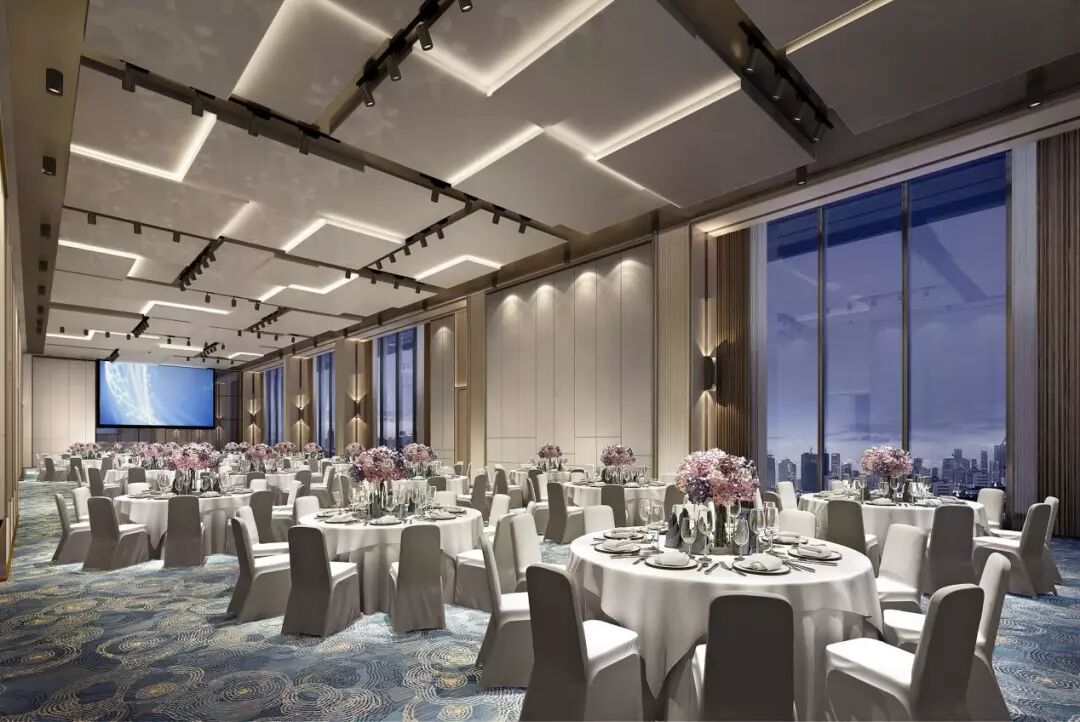宴会厅布局自然顺畅,色调以白灰为主调,灯光点缀的恰如其分,在夜晚,一束束柔光倾泻而下,为宴会厅披上了一套美丽的盛装。材料运用简洁自然,创造出清新脱俗之美。