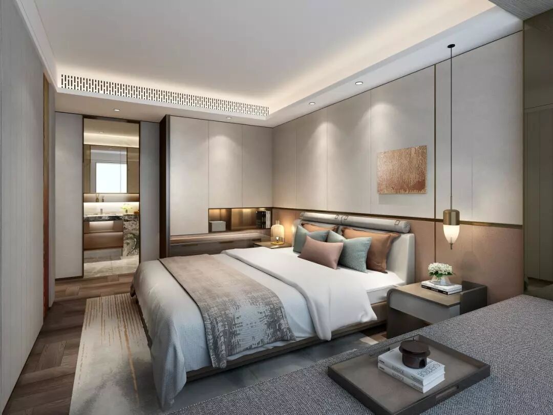 次卧以现代时尚的配色为主,色彩在深浅之间氤氲融合,整个卧室宁静而和谐,温馨且浪漫。