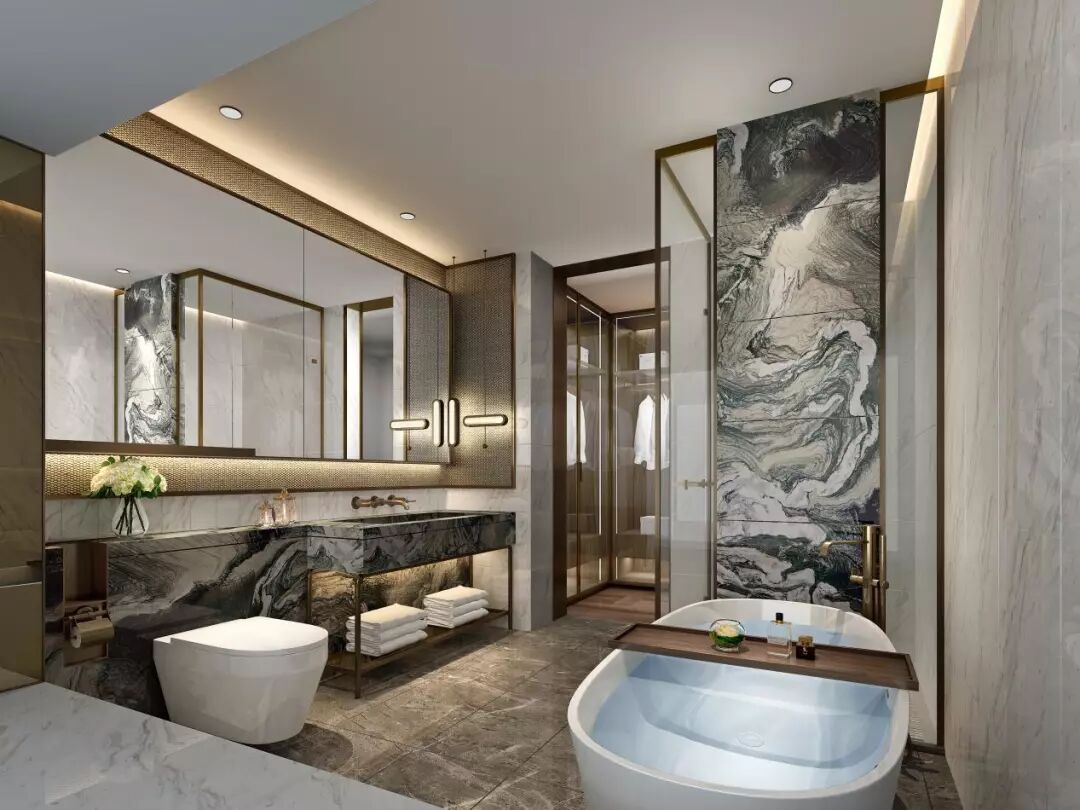 在保证功能性的前提下,设计师将主卫的各个区域串联在一起,紫山水石材的运用如点睛之笔,石纹纹缕似山川河流,小小空间自成一派,宛若一方天地。